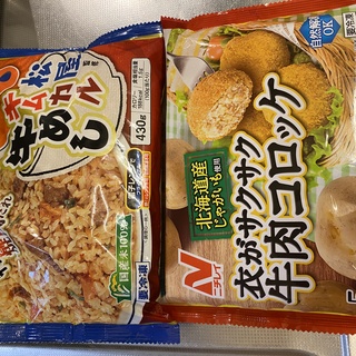 マックスバリュ 田無芝久保店で買って来たニッスイ 松屋監修キムカル牛めしとニチレイ 衣がサクサク牛肉コロッケ。コロッケは明日、台風が来たら(現時点では東京には来ない予報ですが)、食べられるように、と。台風コロッケね。
