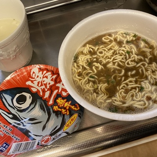 濃厚どろどろな煮干しスープ、すげぇ煮干しの風味が濃い。カップ麺でこの濃厚さ、というか