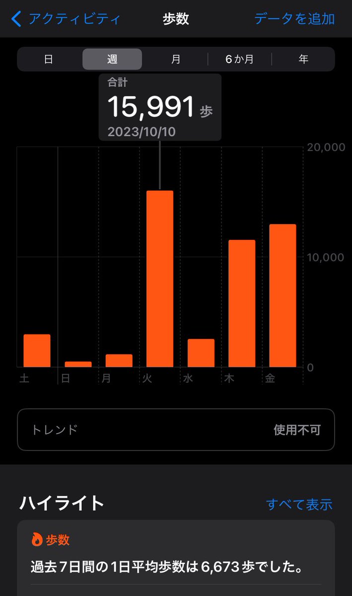 2023年10月7日の歩数は2950歩、8日は485歩、9日は1124歩、10日は15991歩、11日は2522歩、12日は11510歩、13日は12969歩。 pic.twitter.com/UCYNfPE5lv
