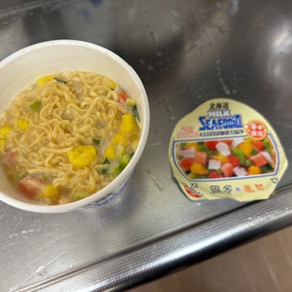 日清カップヌードル 冬季限定 北海道MILK SEAFOO道(北海道濃厚ミルクシーフー道ヌードル)2024【シーフード】でございます。北海道の牛乳から作られた脱脂粉乳使用だそうで。