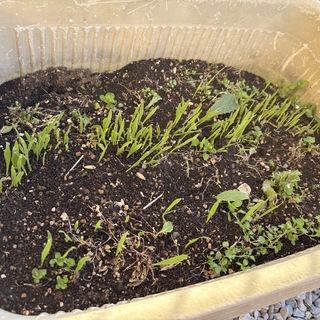 ウサギさんはまだ気づいていないけど、プランターに植えた生チモシー、一部はだいぶ生えてきたね。にしても条件は同じなのになぜ左右のプランターでこれほど成育に差が?