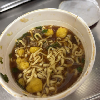 「鶏・豚・香味野菜を効かせたコクある醤油スープ。別添の特製鶏油を入れる事で香ばしい醤油と鶏の旨みをしっかり感じられる食欲そそる味わいに。高コスパカップの至極の一杯。」