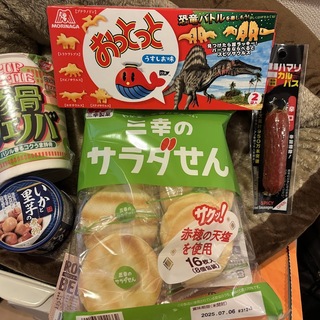 カップヌードル 豚骨ジェノバ バジル香るコクうま豚骨、おっとっと うすしお味 恐竜バトルを楽しもう、いかと里芋の煮物 缶詰、三幸のサラダせん、ハマリカルパス 辛口等。いかと里芋の煮物 缶詰はなんでも酒や カクヤス 武蔵小金井店、その他はMEGAドン・キホーテ東久留米店で。