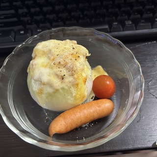 ツナとチーズの玉ねぎグラタン、ウインナー、ミニトマトに納豆ご飯、目玉焼などを食べまして。