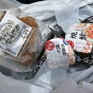押麦入り 大むすび ジャンバラヤ(99円)、氷温熟成焼たらこ(119円)、焼鮭(119円)(全て税抜き)を買って