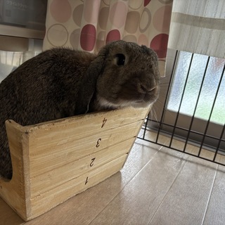 ウサギさんと戯れて。ウサギ用の跳び箱に収まっております。昔はちゃんと跳び箱の体でも小さくて中に入れましたが今は逆にしないと収まりません。
