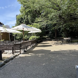 靖国神社 外苑休憩所付近のベンチで休憩。暑いですが日陰ですとそこまで暑くもなく過ごしやすいです。カラッとしているからかな。