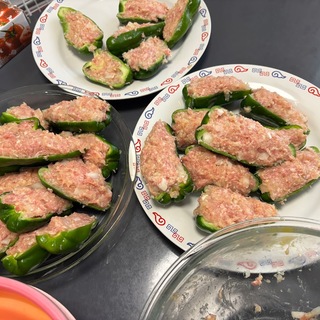 ピーマン肉詰め、肉をつめてました。ワタと種、取らないVer。種で食感上昇や焼いてる時に肉がピーマンから離れにくくなるらしい。確かに実際食べてもワタや種あっても気になりませんね。