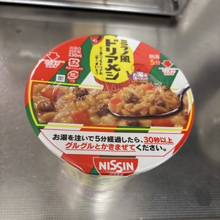日清ミラノ風ドリアメシ(どこ食べてもドリアの一番うまいとこ)。お湯入れて5分待ち、30秒程かき混ぜて