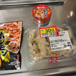 ピーコックで買ってきたMDホールディングスの ちょい呑み専菓 うま塩ホルモン揚げ、いなば 塩こうじ とりレバー たれ味、サクサク鶏皮唐揚げのうち、惣菜のサクサク鶏皮唐揚げを食べたり。
