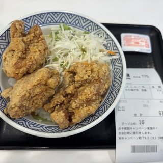 から揚げ丼(並盛)、619円。大きめの鶏唐揚げが3個で食い応えあります。マヨネーズもついとります。