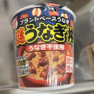 「"謎肉"でも使用している「大豆たんぱく加工技術」を駆使し、うなぎの蒲焼きの食感や見た目を追求した具材(謎うなぎ)が入ったカップメシです!山椒風味の謎うなぎに特製甘辛たれがうなる旨さ!」とあります。