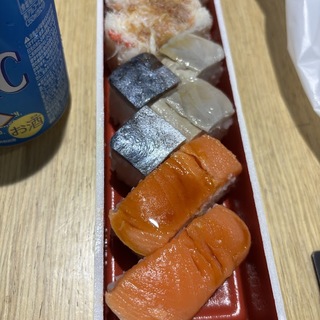すず花のおにぎり さけ(250円)とミックス押し寿司(蟹、鯖、サーモン)【弁当】。子供はおにぎり1個でいいや、という事で。最近、おにぎりにはまってんな。私はさけとミックス押し寿司(蟹、鯖、サーモン)980円。