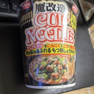 日清 魔改造カップヌードル(ニンニクとニラで魔改造!肉の旨みあふれるもつ鍋しょうゆ味!?)でございます。
