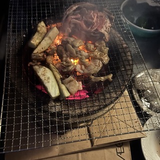 バーベキュー、ラム肉スライスや焼鳥やホルモンや野菜などを焼いて食べまくります。