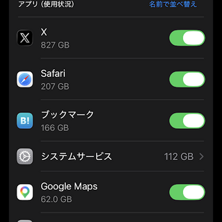 現在までの合計 1.66TB、Twitter(現X)が圧倒的ですがこのiPhone 15を購入した時からの累積なので最近、データ消費量が多くなったアプリはどれだかわからん。