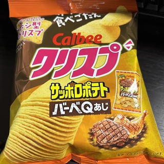 カルビーのポテトチップス クリスプ サッポロポテト バーベQあじ。酒のつまみにちょうどいい味わいでございました。税抜き99円。