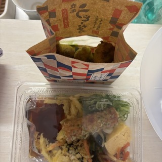 「2種の天ぷらとおかずの定番うどん弁当」と「うどーなつ 抹茶味」を食べました。弁当は490円。うどーなつ 抹茶味は新発売のようです。
