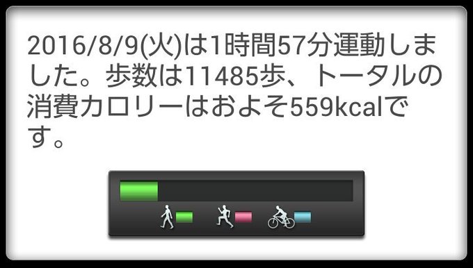8月9日(火)の歩数は11485歩、消費カロリーは559カロリー。 pic.twitter.com/A2qJ9LbIXa