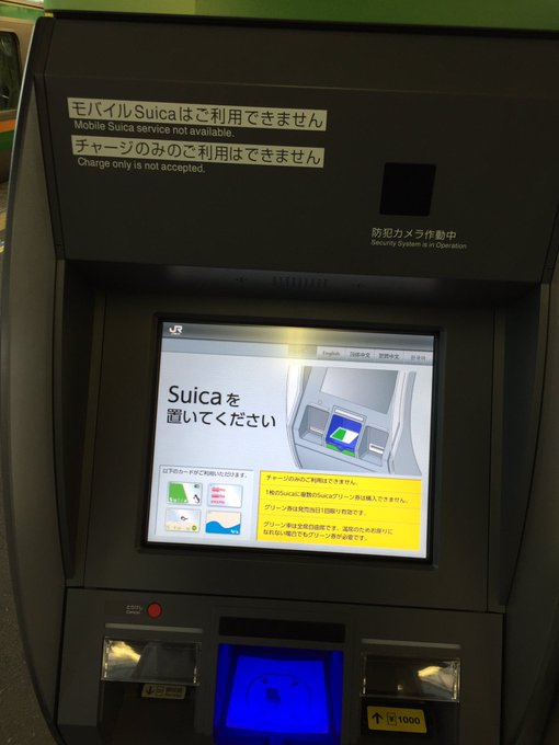 おお!これならカード型以外でもスイカグリーン券が買える、と思ったら対応してないでやんの。なら今までどおり、カード吸い込むタイプで変える必要ねえだろ。スマホのモバイルSuicaぐらい対応してくれよ(書いてあるんだけどさ)。 pic.twitter.com/LWmOGmMOIi