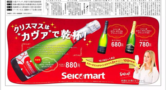 今日の日経電子版地方版北海道のセイコーマートのスパークリングワインの広告、お値段手頃でクリスマスにいいなぁ。 pic.twitter.com/ArMIf11MsM