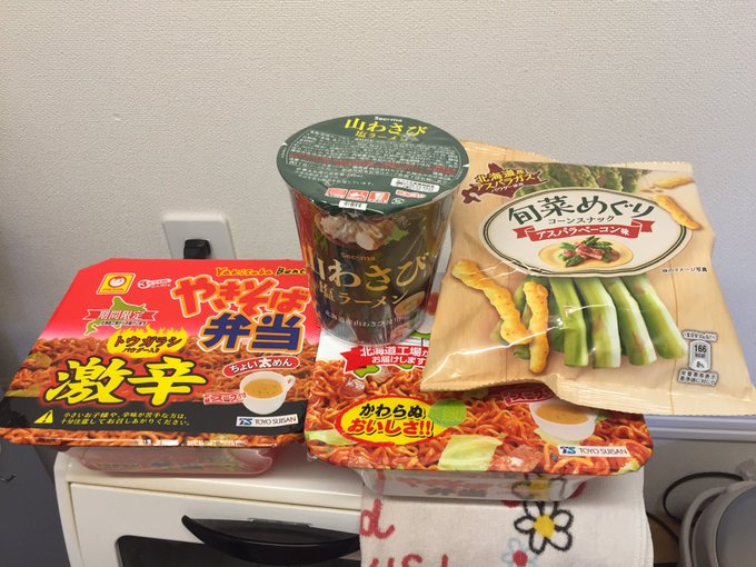 夕飯はたこ焼き、小分けの(スパゲッティナポリタン、ほうれん草ごま和え、ちくわ煮物)、山わさび塩ラーメン。 pic.twitter.com/iq2MseJW2y