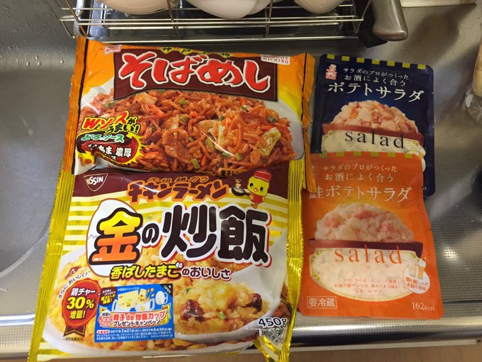 そばめし、チキンラーメン金の炒飯、サラダのプロが作ったつくったお酒によく合うポテトサラダ、サラダのプロが作ったつくったお酒によく合う鮭ポテトサラダを買ってきたわけですが無印のサラダのプロが作ったつくったお酒によく合うポテトサラダを食いました。