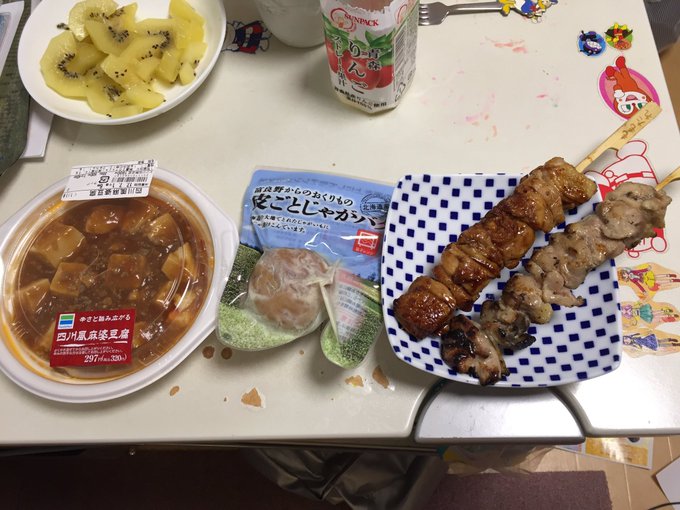 昨日の夕飯は麻婆豆腐丼、焼き鳥、ジャガバター、キウイフルーツ、ヨーグルト。 pic.twitter.com/eedkFdGfaS
