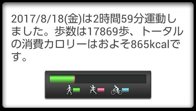 8月18日(金)の歩数は17869歩、消費カロリーは865カロリー。 pic.twitter.com/0196g8eOQT
