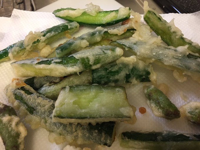 天ぷらにしました。Twitterでキュウリの天ぷらがどうとか流れてきたからやってみたけどなかなか美味い。辛い獅子唐の食べちゃって酒が欲しくなりチューハイ飲んで。
