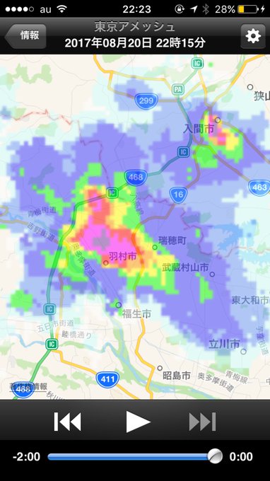 アメッシュ見てたら羽村や福生、一部武蔵村山あたりで30分〜1時間ぐらい、同じ場所で濃い色の部分が続き、都心に向かって動いてない?これから動くのか? pic.twitter.com/DoX9zB2KEX