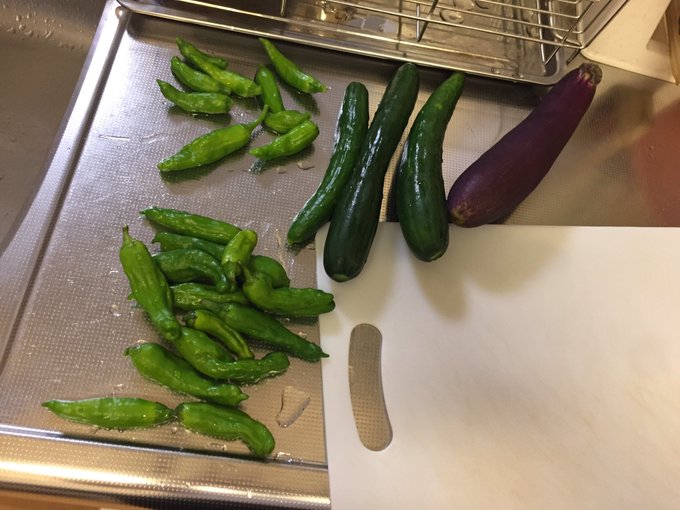獅子唐、胡瓜、茄子です。8月に入り天気もこの状況ですからそこまでは育ちませんが(7月はやばいぐらい出来たなぁ・・・)小さな物も含め収穫。獅子唐は数日前に収穫したのも一緒に。