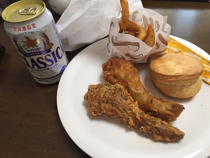 昼飯はケンタッキーフライドチキンで買ってきた濃厚香味バターチキン、オリジナルチキンの食べ比べセット、発酵バター入りビスケット等。これはもうビールしかないわw pic.twitter.com/XQdktRw86r