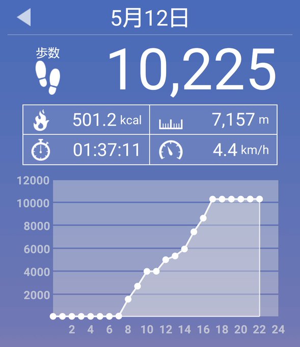 5月12日(土)の歩数は10225歩、消費カロリーは501カロリー。 pic.twitter.com/nd5QkLNCeR