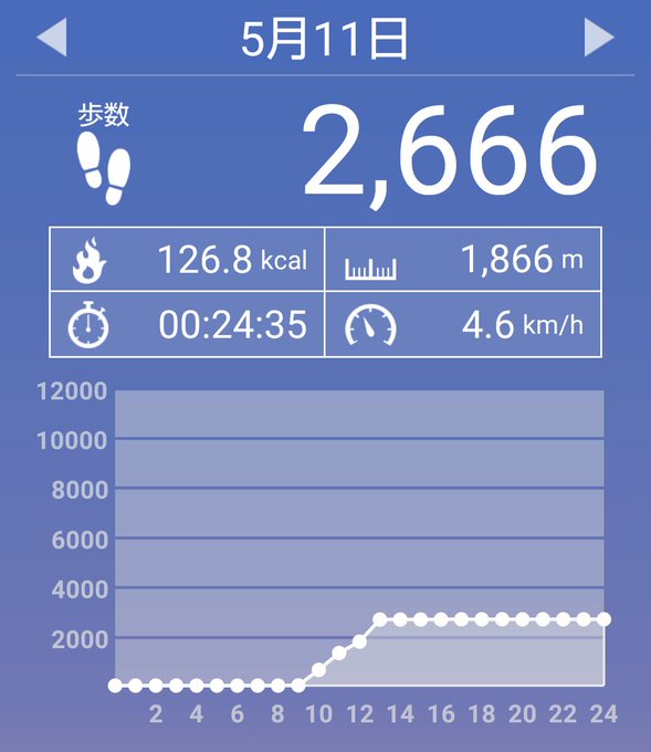5月11日(金)の歩数は2666歩、消費カロリーは126カロリー。 pic.twitter.com/dDzgcbFAS8