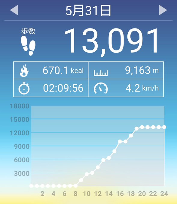 5月31日(木曜日)の歩数は13091歩、消費カロリーは670カロリー。 pic.twitter.com/Qz3rVdaa2u