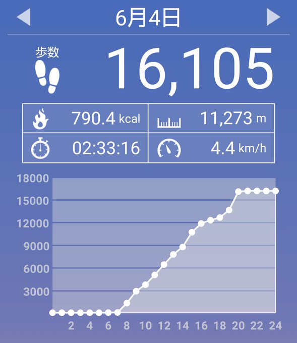 6月4日(月)の歩数は16105歩、消費カロリーは790カロリー。 pic.twitter.com/kbyLupGsYU