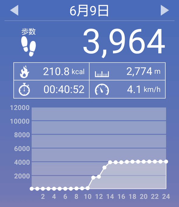 6月9日(土)の歩数は3964歩、消費カロリーは210カロリー。 pic.twitter.com/hTNzzCejK7