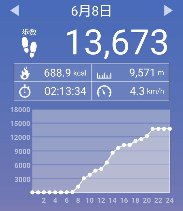 6月8日(金)の歩数は13673歩、消費カロリーは688カロリー。 pic.twitter.com/QHewG1uJoY