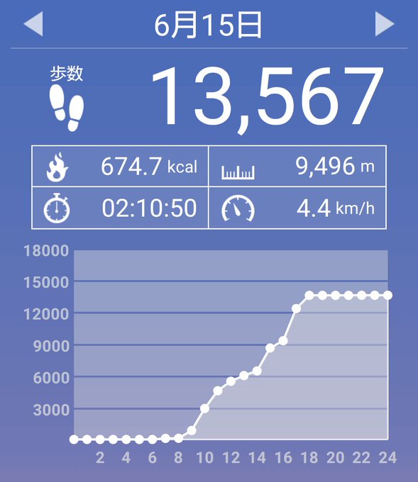 6月15日(金)の歩数は13567歩、消費カロリーは674カロリー。 pic.twitter.com/m5LrrudPFW