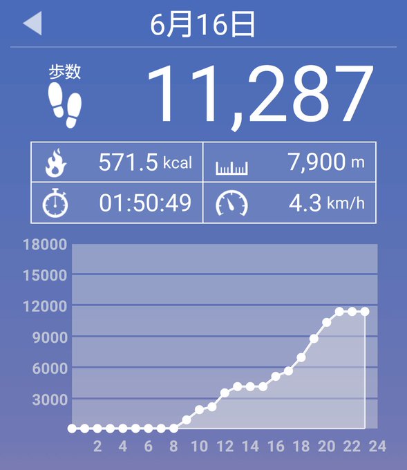 6月16日(土)の歩数は11287歩、消費カロリーは571カロリー。 pic.twitter.com/YpoqaerxBH