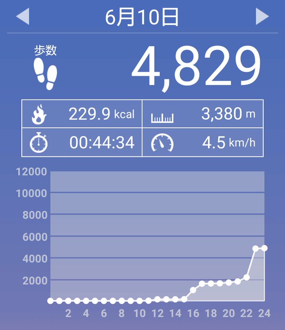 6月10日(日)の歩数は4829歩、消費カロリーは229カロリー。 pic.twitter.com/DSuPRtXCJZ