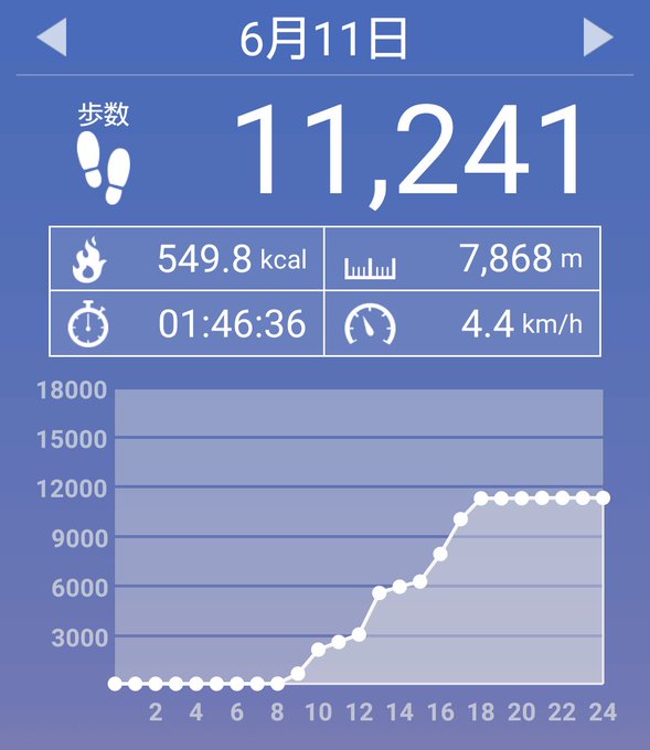 6月11日(月)の歩数は11241歩、消費カロリーは549カロリー。 pic.twitter.com/OiIWi0bfHe