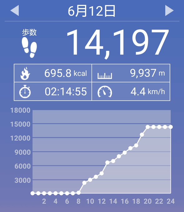 6月12日(火)の歩数は14197歩、消費カロリーは695カロリー。 pic.twitter.com/8FNGN6aAu3