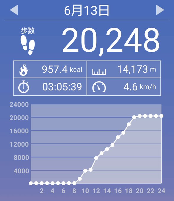 6月13日(水)の歩数は20248歩、消費カロリーは957カロリー。 pic.twitter.com/HVvjnDuCLf