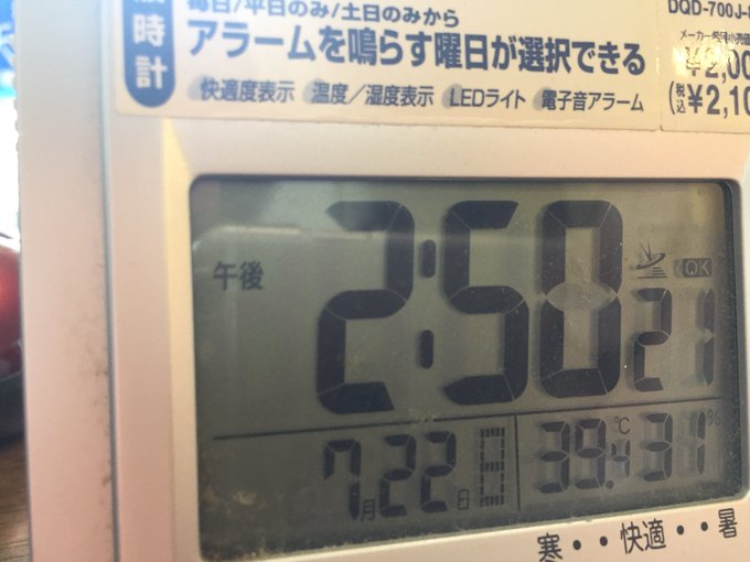 東京都小平市、7月22日(日)の今頃の気温は36度予想。実際に気温計付き時計を庭に置いてみると39.4度w 置いた場所は子供の頭ぐらいの高さでアスファルトでもない人工芝の上なのにw これ、道路上とかだとシャレにならんやろ・・・・・というか明日の39度予測も気になる・・ pic.twitter.com/HW2hz6b2cF