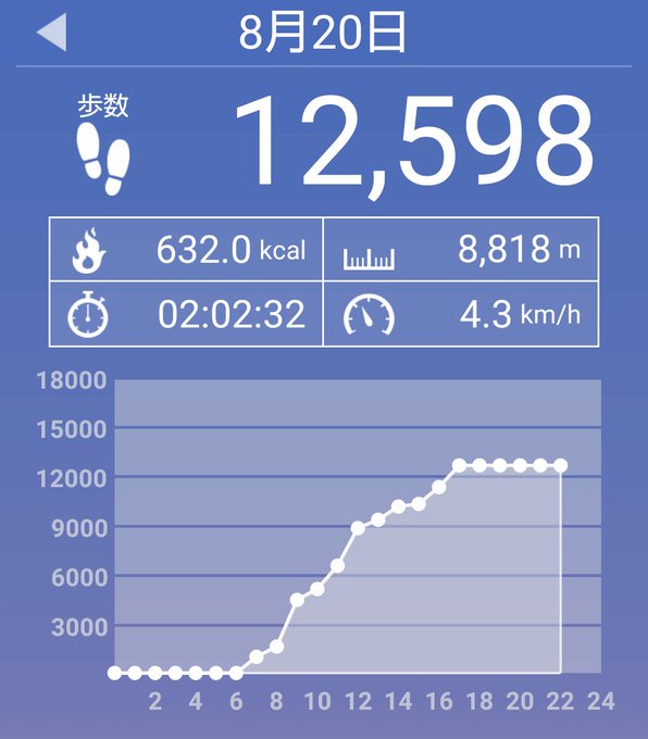 8月20日(月)の歩数は12598歩、消費カロリーは632キロカロリー。 pic.twitter.com/iskWI53IrI