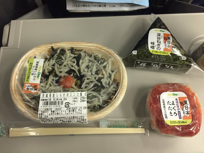 夕飯は駅ナカコンビニ NewDays(ニューデイズ)で買った茨城県産しらすのミニご飯、深谷ねぎの味噌おにぎり、寿司むすび まぐろたたき(静岡県産わさび使用)。いずれも東日本旨いものフェアの。美味かった。 pic.twitter.com/AjI0xsVrna
