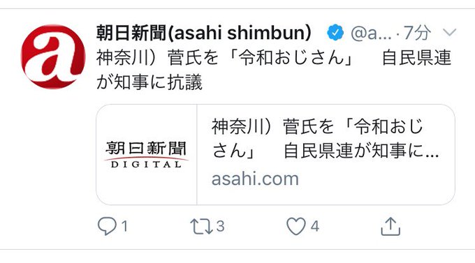 @asahi 神奈川)菅氏を「令和おじさん」 自民県連が知事に抗議 何このニュース。リンク先はリンク切れだし・・・・ pic.twitter.com/HBkkL0SJV9