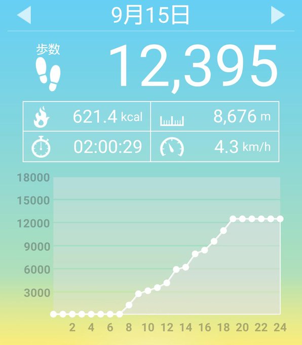 9月15日(火)の歩数は12395歩、消費カロリーは621キロカロリー。 pic.twitter.com/dfsyXnFpLv